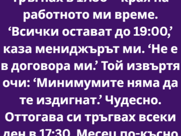 Взех дисциплинарна забележка, защото излязох от работа в 17:30 – точно когато свършваше работният ми ден. Листчето стоеше на бюрото ми, бяло и злобно, сякаш...