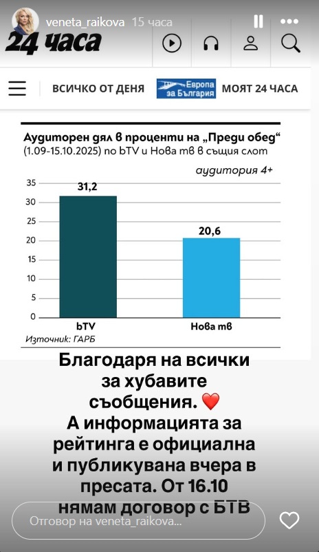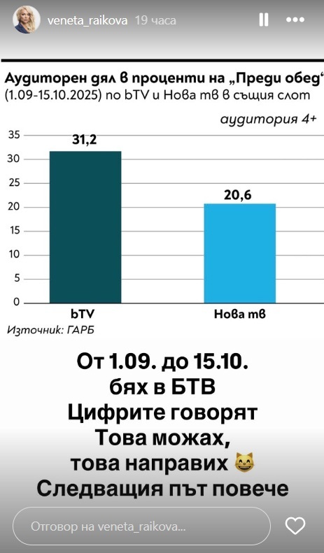 Освен това, бившата водеща качи още няколко сторита, включително проучване, което показва, че в този часови пояс рейтингът на бТВ е бил значително по-висок от този на конкурентната Нова телевизия (по това време там се излъчва „На кафе“ с водеща Гала, бел.р.)