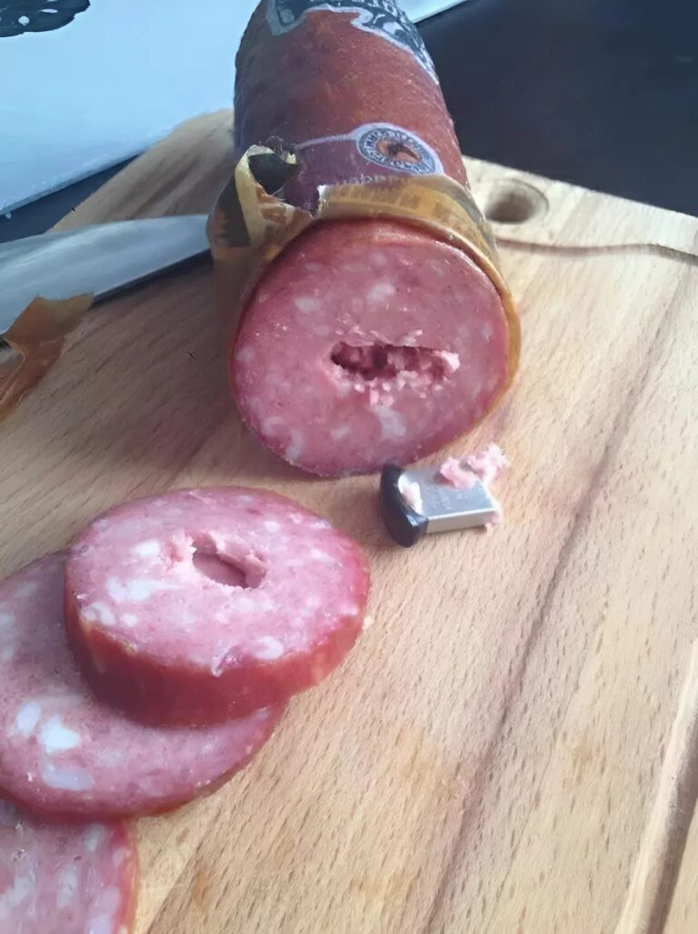 Първата ми мисъл беше, че е някакво метално парче. Започнах внимателно да го изваждам и от розовата маса се показа… флашка. Съвсем обикновена, няколкогигабайтова флашка! Побиха ме тръпки — все пак вече бях ял от този салам. Как е възможно подобно нещо да се озове във фабричен хранителен продукт, и то не от най-евтините?