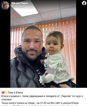 Николай Попов – бащата на Сияна, която загина трагично при катастрофа – публикува нов трогателен пост в социалните мрежи. На снимката към публикацията той държи в ръцете си малко момиченце. Попов пояснява, че това е Елиза – бебе, което се е родило с тежки увреждания, но лекарите в „Пирогов“ са успели да го спасят по чудо.