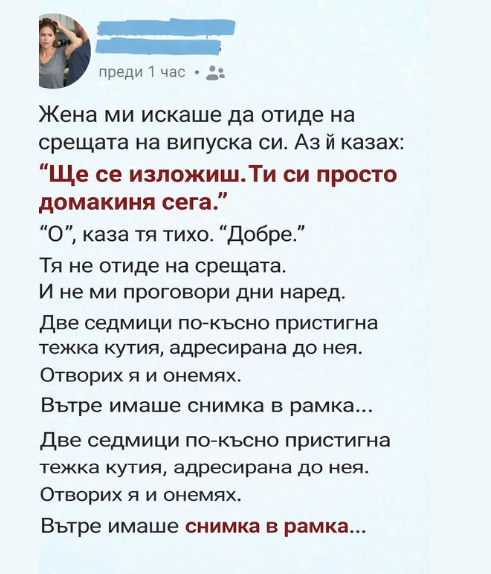 Тя стоеше до кухненския плот, връзваше косата си по онзи стегнат, безмълвен начин, с който винаги показваше, че не иска да се надява на нищо. Зад нея децата спореха – за домашни, за липсващ чорап, за това кой е взел синята чаша. Животът ни беше шумен и хаотичен, а аз вече го приемах за неизбежен фон.