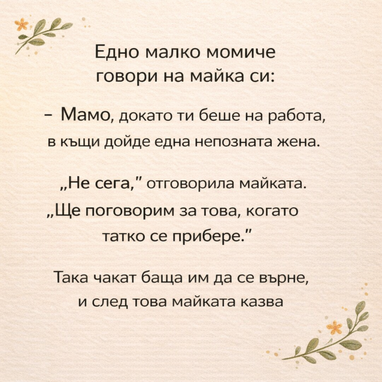 Представете си напълно обикновена семейна сцена: малко момиче, седнало на масата, майка, която прибира покупките, и баща, който се прибира от работа. Всичко изглежда спокойно… докато една неочаквана подробност не заплашва да хвърли дома в пълен хаос. Когато детското въображение се сблъска с реалността на възрастните, резултатът може да бъде не само объркващ, но и неустоимо смешен. Пригответе се за история, която ще ви накара да настръхнете… от смях.