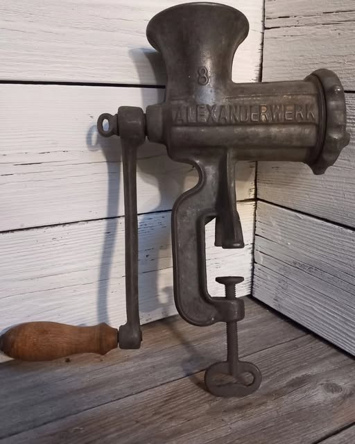 Тази месомелачка работи със спираловиден механизъм: месото се поставя от едната страна, манивелата се завърта и фино смляното месо излиза през метална решетка. Просто, практично… и напълно ръчно. Изобретена през XIX век, месомелачката променя начина, по който хората готвят – край на дългото и изморително кълцане с нож. Само с няколко завъртания плънката е готова.