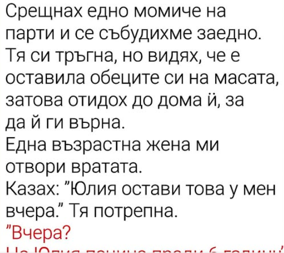 Той не успя да каже нищо повече. Жената грабна обеците, притисна ги до гърдите си.