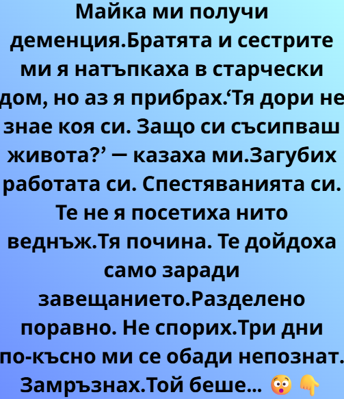 „Ако слушате това“, каза тя, „значи вече ме няма и значи пак сте дошли да вземате. Слушайте внимателно. Дяловете оставям на Елица. Защото тя беше до мен, когато вие избрахте да бъдете далеч. И ако някой се опита да я притисне с дългове, с банката или с детето ѝ… ще има съд. И ще има срам. Не заради нея. Заради вас.“