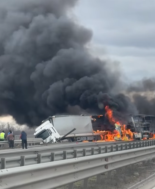 Според първоначалните данни, единият камион е преминал през мантинелата и е навлязъл частично извън платното. В този момент втори тир се е блъснал в ремаркето му, тъй като водачът не е успял да спре навреме. Ударът е предизвикал тежка деформация в кабината на задния камион.